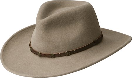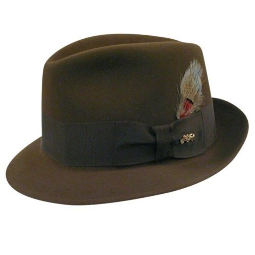 A timeless dress style fedora with a smooth 100% fur felt finish. This hat has earned the Golden Coach Quality standard from Dobbs. Finished off with a wide grosgrain band and bow with feather.
